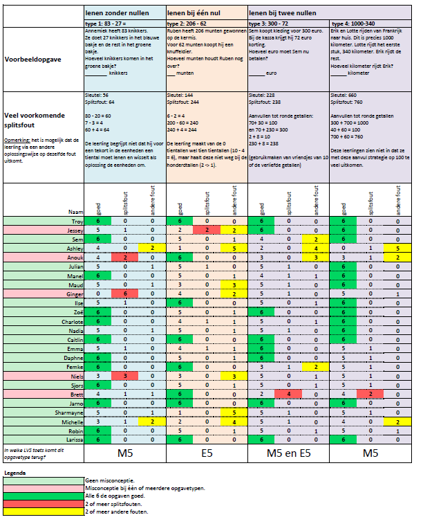 Het tweede instrument dat we hebben ontwikkeld heet Splits en is gericht op het diagnosticeren van systematische fouten bij aftrekken. Splits is een papieren toets die verschillende typen aftrekopgaven zoals 83 – 57 = ; 300 – 72 = en 1000 – 680 = bevat. Met Splits kan op basis van de incorrecte antwoorden van de leerling worden vastgesteld in welke mate een leerling het concept overbruggen begrijpt. De leerkracht krijgt na het afnemen van de diagnostische toets een rapportage waarin per leerling te zien is voor welke typen aftrekopgaven de leerling het concept overbruggen onvolledig begrijpt. In de figuur hieronder is een voorbeeld rapportage te zien. De leerkracht kan hier vervolgens – naar eigen inzicht – zijn of haar lespraktijk op aanpassen.