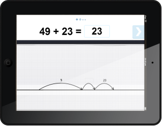 Het eerste instrument dat we hebben ontwikkeld is een tabletapplicatie voor optellen en aftrekken, genaamd de G3T4LL3NL1JNapp. Leerlingen kunnen in deze app gebruik maken van een lege getallenlijn om de optel- en aftrekopgaven op te lossen. In de figuur hieronder kun je zien hoe de applicatie en zo’n oplossing op de getallenlijn eruit zien.